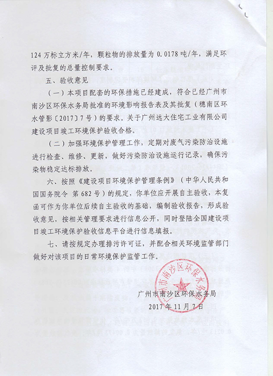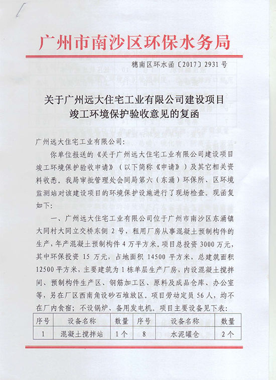 關于廣州遠大住宅工業有限公司建設項目竣工環境保護驗收意見的復函